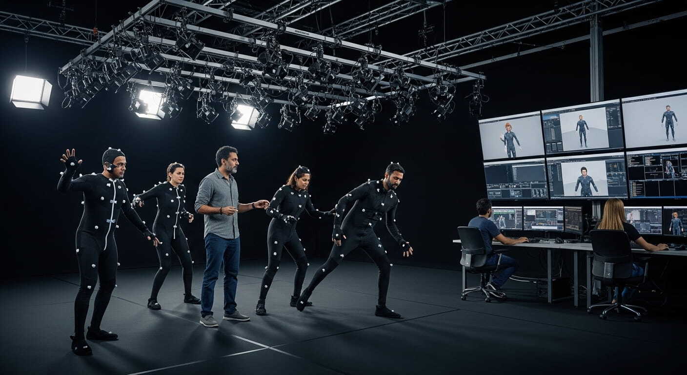 A: It’s a specialized studio equipped with high-precision cameras (like the Vicon Valkyrie) that track human movement with sub-millimeter accuracy and turn it into digital data for 3D characters.